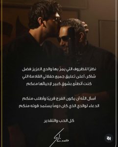 وكتب محمد فضل شاكر، عبر حسابه الرسمي بتطبيق انستجرام: «نظرا للظروف التي يمر بها والدي العزيز فضل شاكر، أعلن تعليق جميع حفلاتي القادمة التي كنت أتطلع بشوق كبير لإحيائها معكم.. أسأل الله أن يكون الفرج قريبا وأطلب منكم الدعاء لوالدي الذي كان دوماً يستمد قوته منكم.. كل الحب والتقدير».
