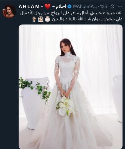 ونشرت أحلام رسالة عبر حسابها الرسمي على منصة «إكس» قالت فيها: «ألف مبروك حبيبتي آمال ماهر على الزواج من رجل الأعمال علي محجوب، وإن شاء الله بالرفاء والبنين».